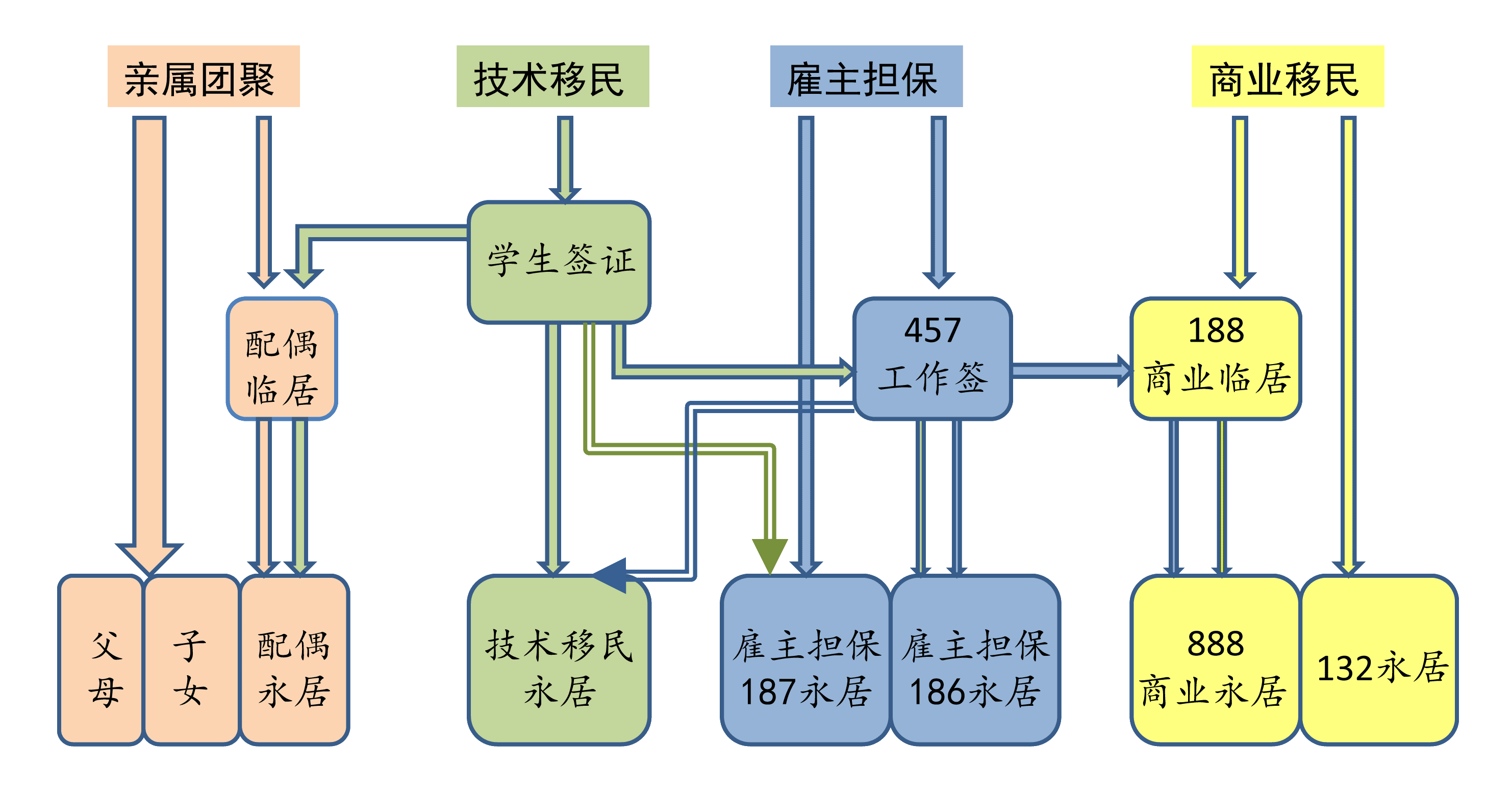移民澳大利亚,主要有以下4个途径(见图示)。